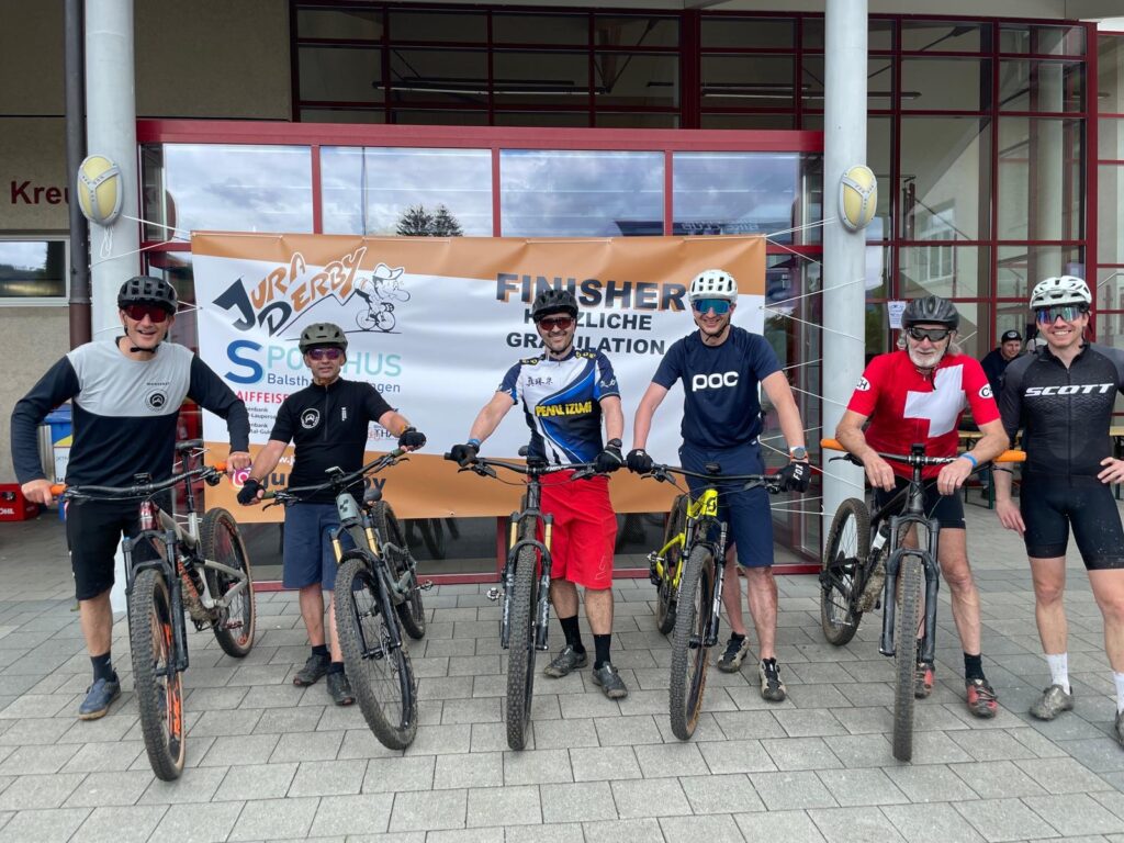 Naja – ein Gutes hatte diese Plackerei, denn nun waren wir am höchsten Punkt der diesjährigen Jura Derby Runde angelangt. Ab jetzt sollten nun wieder die spassigen Meter, Kilometer folgen. So war es auch bis auf einen kleinen Schreckmoment, als sich das Vorderrad bei xxx plötzlich in ungewollte Richtung verabschiedet und die Schwerkraft Rolf zu einer Bodenprobe zwingt. Ausser ein paar Schürfungen ist zum Glück nichts Schlimmeres passiert und alle Starter sind wieder heil im Ziel angekommen!