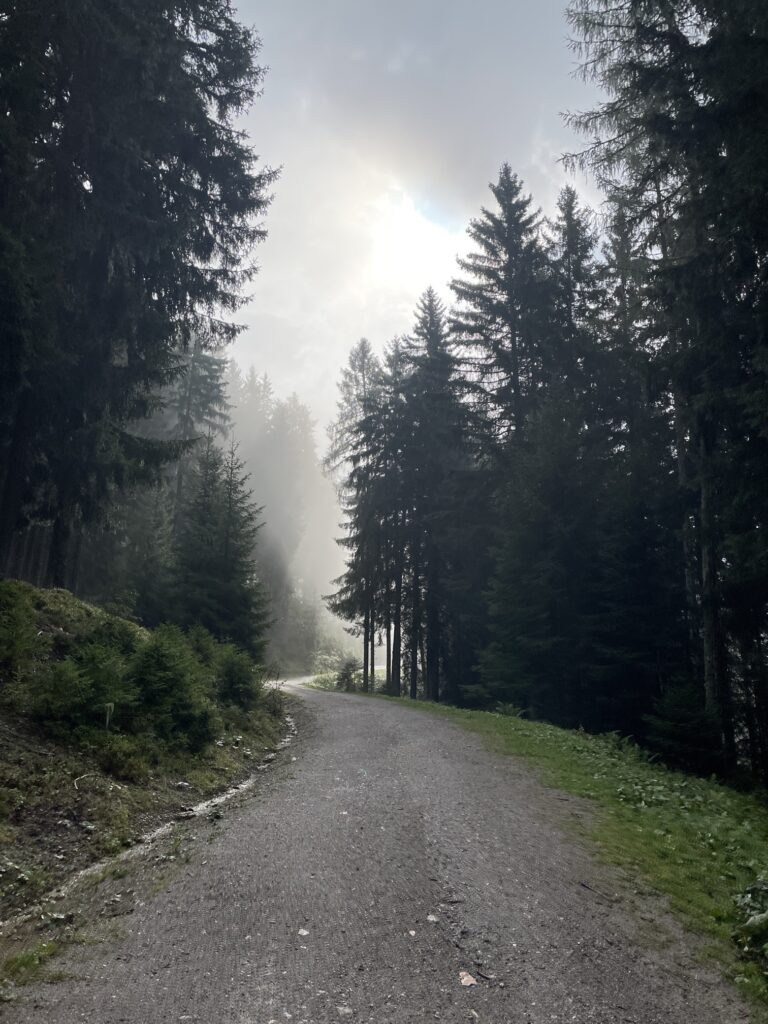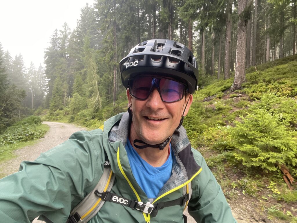 Von schöner Aussicht zu sprechen war nicht wirklich gegeben, wie ihr dem nebligen, trüben Foto obenstehend entnehmen könnt. So sind wir schnurstracks weiter Richtung nächsten Checkpoint zum *MANDLBERG* geradelt. Das war eine „easy“ Teilstrecke, weil mehrheitlich talabwärts gefahren werden konnte. Bei nasser Unterlage waren die Trails aber zum Teil sehr rutschig…