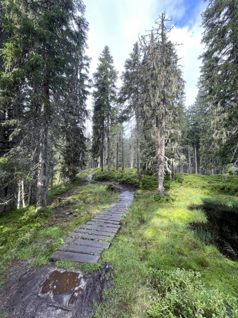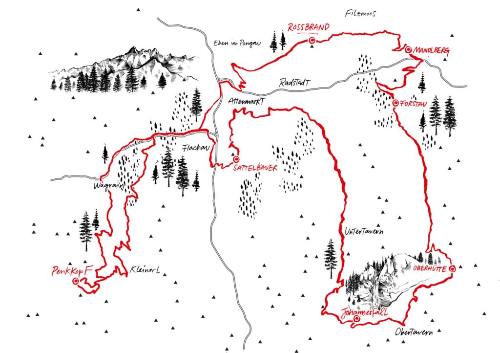 Das ist die aktuelle Stoneman Taurista Strecke 2025. Am ersten Tag (Freitag) sind wir von Flachau gestartet und haben den Checkpoint *ROSSBRAND* ins Visier genommen. Das war bereits ein kräftiger Anstieg mit fast 1000 Höhenmeter zum Start. Schöne Wald- und Moorlandschaft sowie eine erste Duftnote mit Schiebepassage gab es zu Beginn. Hätten wir gewusst, was noch alles kommt zur späten Stunde, wir hätten uns wohl totgelacht über das bisschen Schieben am Vormittag.