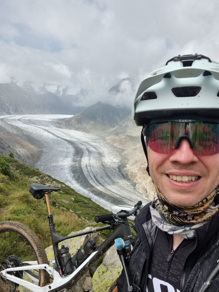 Zurück Richtung Fiesch und dann den wunderschönen Trails entlang zur Bettmeralp. Ab hier an geht es weiter hoch zur Moosfluh auf 2334 MüM. Der nächste Checkpoint, Karte lochen und wieder weiter. Nach kurzer Zeit war er dann zu sehen, der Aletschgletscher in seiner ganzen Pracht. Einer der eindrücklichsten Momente an diesem Tag auf dieser Tour. Schnell ein Foto für das Album und ein bisschen Kleider anziehen für die kommende Abfahrt.